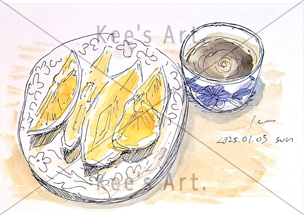 いつもの食器で食べた「紅まどんな」のスケッチも悪くない。