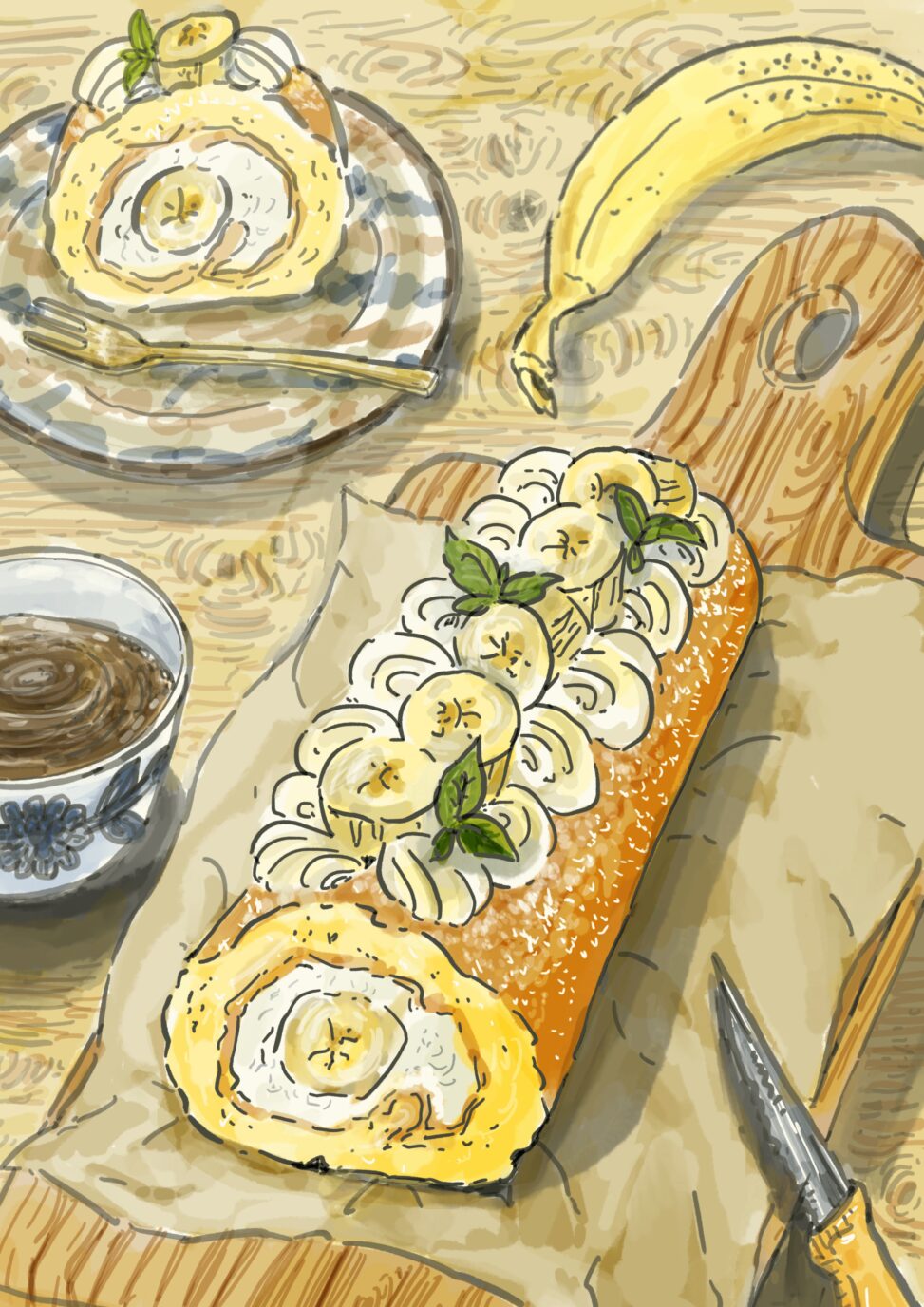 バナナのロールケーキは実際に近場には売ってなくて、ネットでも探したけど食べられるところは無さそうだったから、妄想で描いてみたよ。