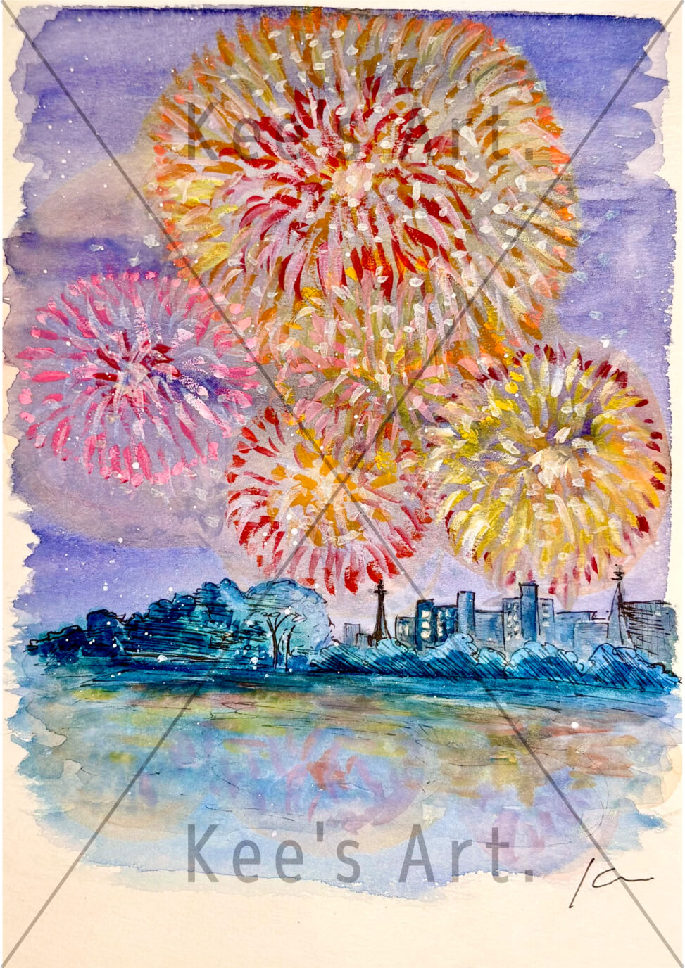 花火 夜空に打ち上がる花火には、誰が作ったかなんて書いてないしわからないのに、みた人の心にあとを引く感動が残る。そんな花火のようなアートを私も届けたいって思った。 2025年8月制作 線画 ぺんてる ポイントライナーペン ブラック 色塗り ぺんてる クリーンえのぐ(エフ水彩) 2025-10-10 投稿先 Landscape - 風景 -, Watercolor sketch work - アナログ - 2025年の作品 次の投稿へ →