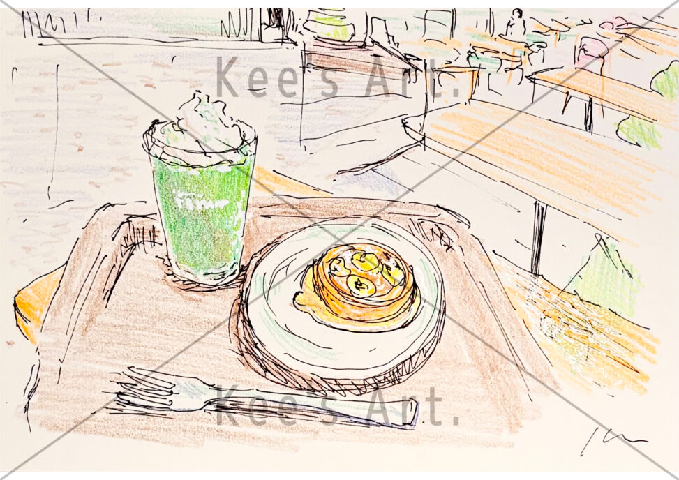 引きで描くと、風景画のようになるよね。カフェの空間を描いている感じだからか、そのときの食べた味とか、過ごした時間とかを思い出すわ。